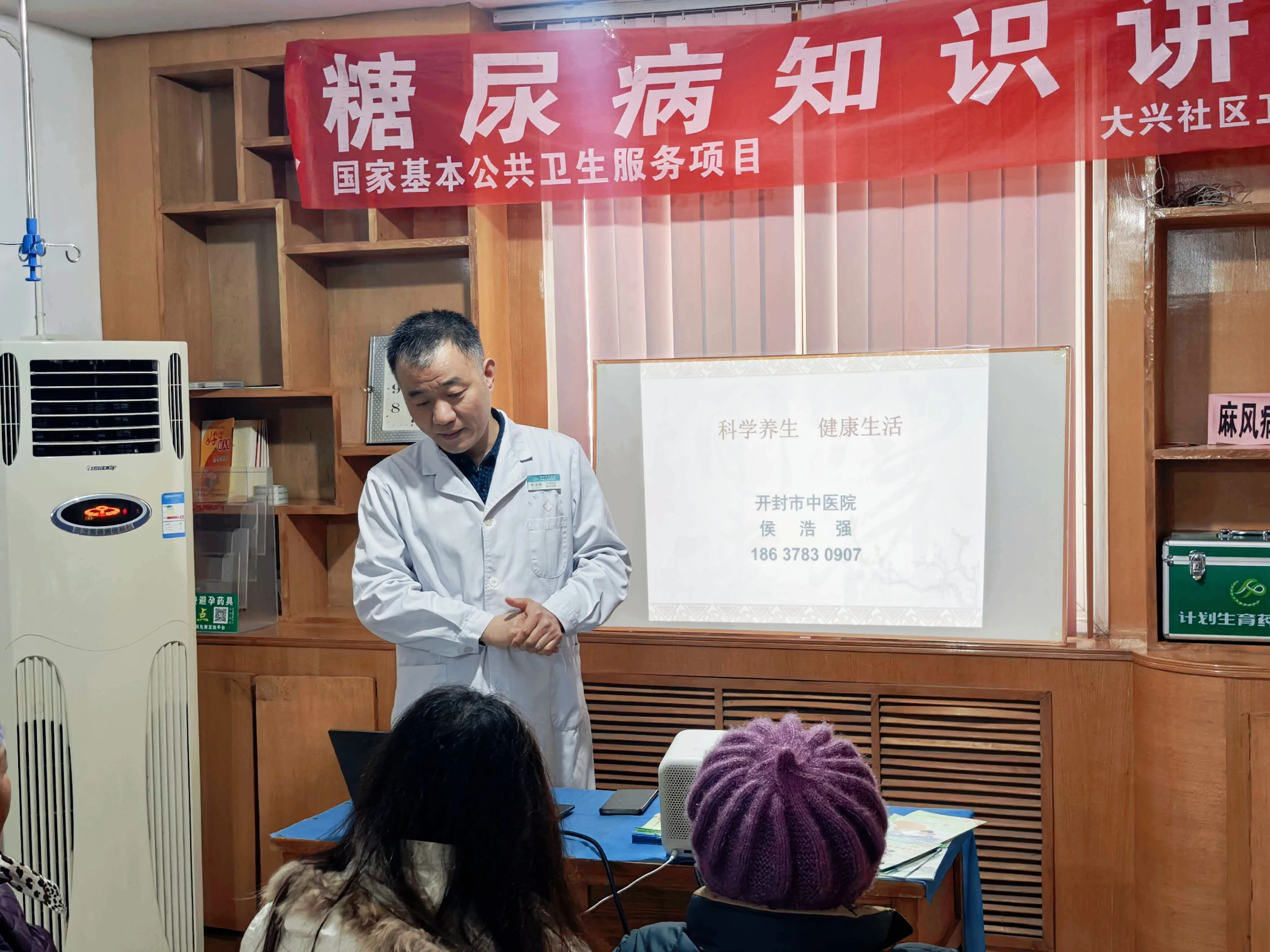 12月18日下午三点,开封市龙亭区大兴社区卫生服务站里坐满了人。开封市中医院内分泌科侯浩强主任正站在投影仪前,以《科学养生,健康生活》为主题,为社区居民带来一堂特别的健康课。一页页图文并茂的PPT,配上侯浩强主任深入浅出的讲解,将专业的医学知识变得通俗易懂。这场宣教的内容很“硬核”——从糖尿病的诊断标准、危险因素,到并发症的警示信号、药物的正确服用……每一个话题都关乎居民的健康底线。