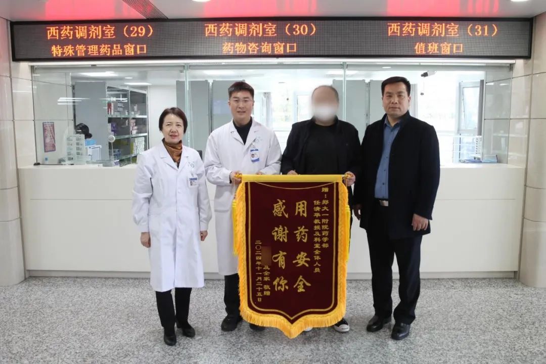 11月26日上午,在郑大一附院东院区门诊药房门口,一位患者家属拉着任清华药师的手不停地感谢着,并送来了印有“用药安全 感谢有你”的锦旗和一封真挚的感谢信。