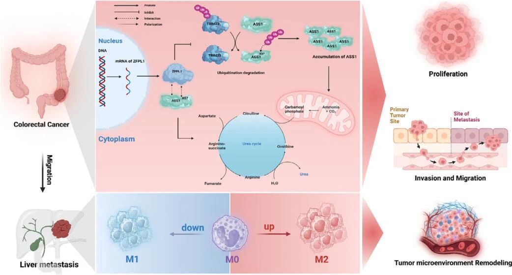 近日,国际期刊《Advanced Science》(IF=14.1)发表原创研究论文《ZFPL1 Promotes Colorectal Cancer Progression by Stabilizing ASS1 to Drive the Urea Cycle and M2 Macrophage-Mediated Metastatic Colonization》,首次系统揭示了在结直肠癌肝转移中,名为ZFPL1的关键蛋白为新的核心靶点及其作用机制,并成功筛选出丹酚酸B为最佳候选靶向抑制剂,为解决结直肠癌肝转移难题带来了新的曙光。