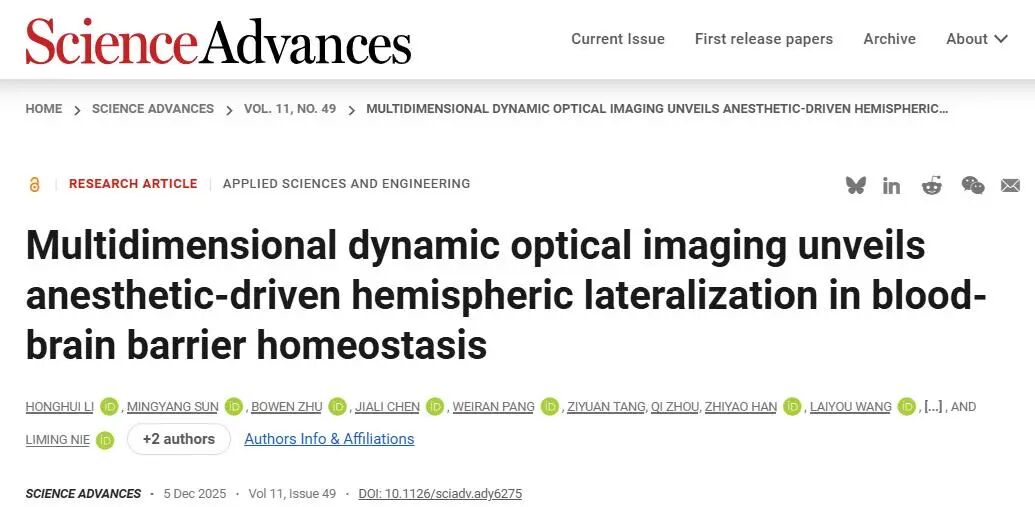 近日,河南省人民医院张加强教授团队和广东省人民医院聂立铭教授团队合作,在国际权威期刊《Science Advances》在线发表论文《Multidimensional dynamic optical imaging unveils anesthetic-driven hemispheric lateralization in blood-brain barrier homeostasis》,首次系统揭示了血脑屏障的空间异质性及其生理意义。