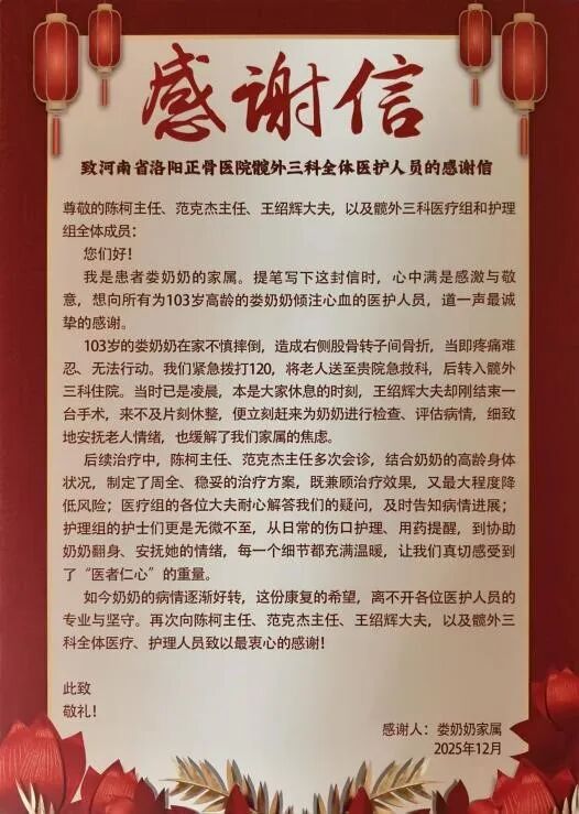 近日,河南省洛阳正骨医院(河南省骨科医院)洛阳院区老年髋部骨折MDT病房上演了一场温暖而高效的“生命保卫战”。103岁高龄的娄奶奶因不慎摔倒导致右侧股骨转子间骨折,在老年髋部骨折MDT快速救治通道的全程护航下,入院后第一时间完成影像、彩超等检查,从入院到顺利完成PFNA内固定手术仅用时32小时。术后娄奶奶恢复良好,家属欣喜万分,特向医护团队赠送锦旗与感谢信,表达深深的感激之情。