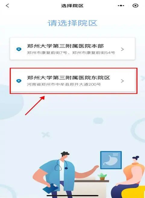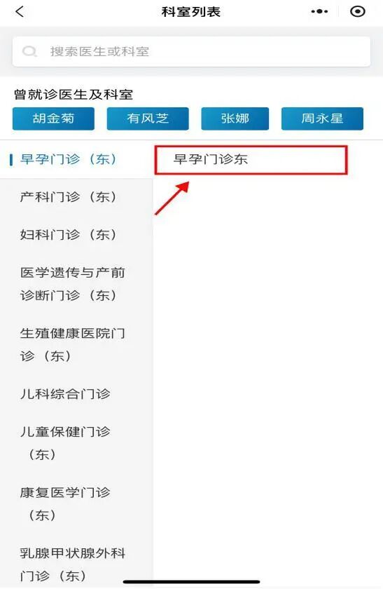 1.微信公众号搜索“河南省妇幼保健院” → 点击“掌上医院”→选择东院区 → 预约挂号 → 选择早孕门诊(东)