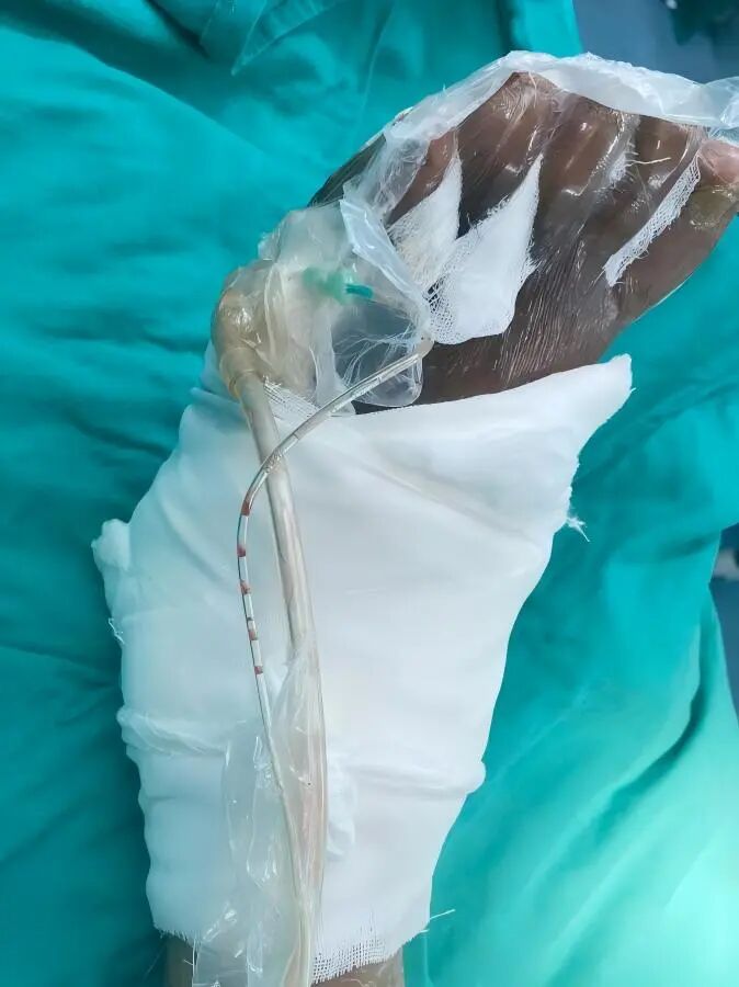 医生精准扩创,彻底清理掉感染坏死的组织、死骨及受感染的骨髓 —— 当坏死组织被清除的瞬间,王先生原本剧烈的疼痛立刻缓解,术后当天高烧也退了下去,精神状态明显好转。