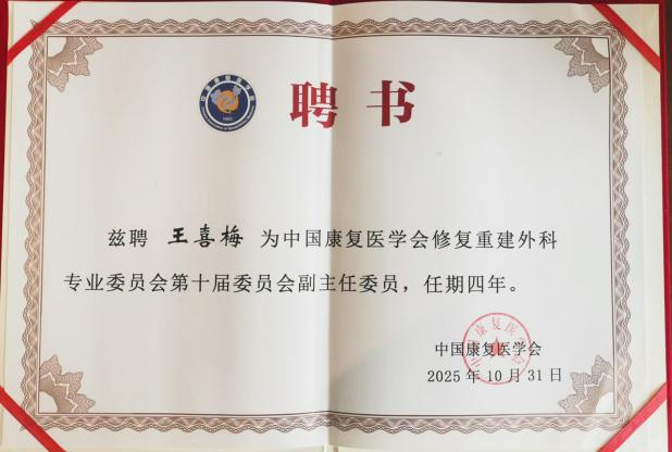 郑大一附院王喜梅教授当选中国康复医学会修复重建外科专委会副主任委员