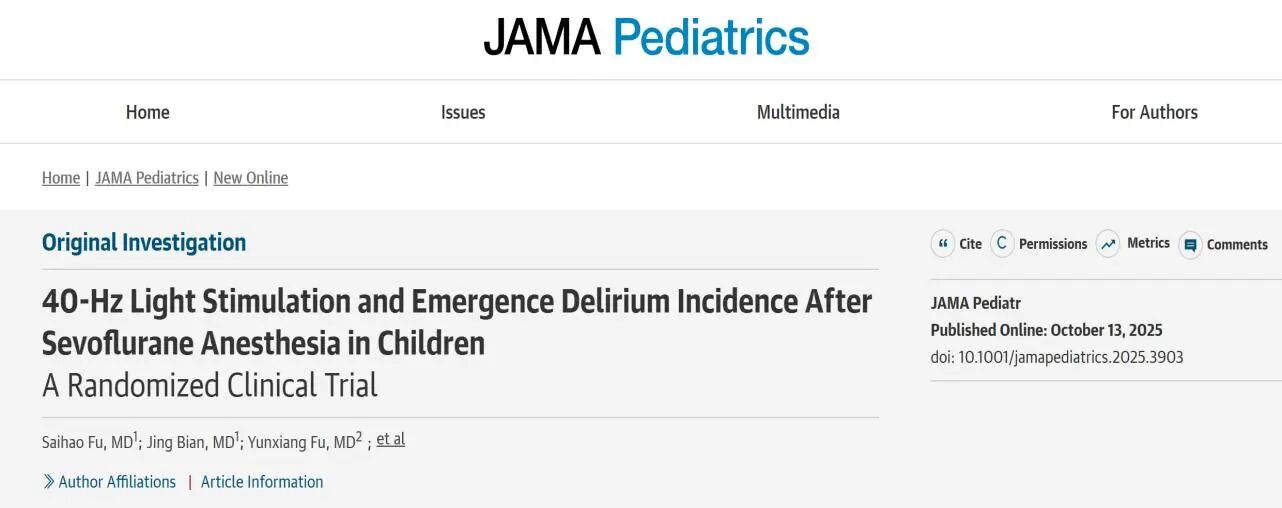 近日,河南省人民医院麻醉与围术期医学科张加强与孙铭阳团队在国际权威期刊《美国医学会儿科期刊》(《JAMA Pediatrics》)在线发表论文《40-Hz Light Stimulation and Emergence Delirium Incidence After Sevoflurane Anesthesia in Children: A Randomized Clinical Trial》。研究揭示了在全身麻醉诱导后使用40Hz光刺激干预1小时,可显著降低儿童麻醉苏醒期谵妄的发生率。该研究为儿科麻醉安全提供了全新的非药物干预方案。